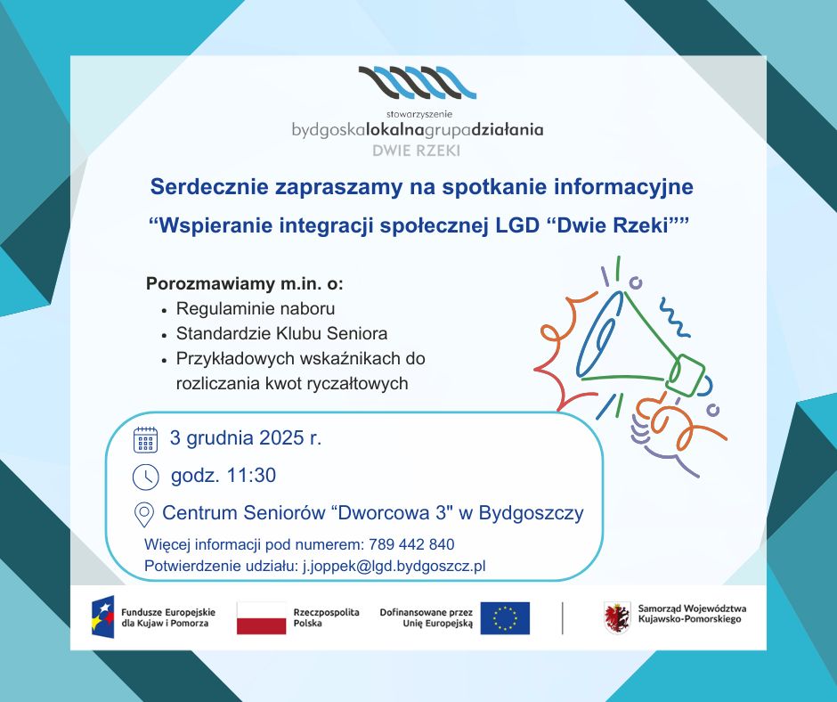 Stowarzyszenie Bydgoska Lokalna Grupa Działania "Dwie Rzeki" zaprasza na spotkanie informacyjne, które odbędzie się w dniu 3 grudnia od godz. 11:30 w Centrum Seniorów „Dworcowa 3”, przy ul. Dworcowa 3 w Bydgoszczy. Spotkanie adresowane jest dla reprezentantów podmiotów zainteresowanych aplikowaniem w ramach naboru pt. "Wspieranie integracji społecznej LGD „Dwie Rzeki”".